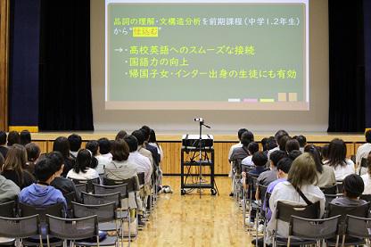 今回の説明会では、本校の教育の柱である英語と数学のカリキュラムについて、詳しくご説明しました。