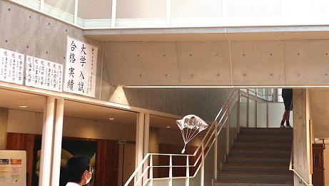 2日目は、いよいよ自分だけのオリジナルロケットの製作です。この日の最後には、「ウズラ隊員」を守るために必要不可欠なパラシュートを飛ばす実験が行われました。アトリウムにひらひらと落ちてくるパラシュートの様子を職員室の先生方が見守る様子も見受けられました。