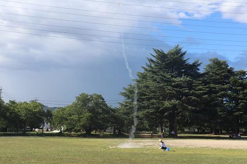 そして最終日。3日間かけて作り上げたロケットを手に、打ち上げ隊は蚕糸記念公園グラウンドへ。参加者の緊張と期待が高まる中、「5、4、3、2、1...発射!」という声とともに、轟音と白煙を上げながらロケットは勢いよく大空へと飛び立ちました。最高到達点に達すると、パラシュートが開いてゆっくりと地上へ舞い戻ってくるロケット。見事に成功し、卵の「隊員」を無事帰還させられた参加者からは歓声が上がり、惜しくも失敗してしまった参加者も、異学年の仲間たちと努力を讃えあいました。
