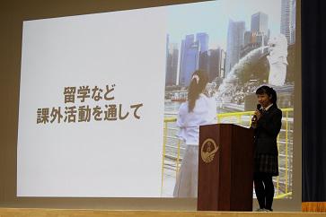5年生からは、タンザニアとシンガポールへそれぞれ短期留学した生徒が登壇し、現地での学びや人々との交流を通して「自分の考えを言葉で伝える大切さ」や「多様な価値観に触れることの面白さ」を語ってくれました。異文化の中で自分を見つめ直す姿勢に、会場の生徒たちも真剣に耳を傾けていました。
