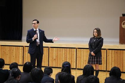 また、この日は新たに本校で学ぶ留学生の挨拶もありました。最初のあいさつは日本語で行われ、緊張しながらも笑顔で自己紹介をする姿に、大きな拍手が送られました。これからの学校生活で、互いに学び合い、交流を深めていくことが期待されます。