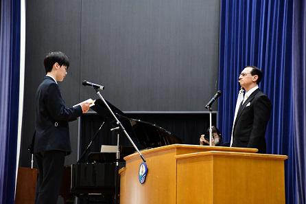 進級生代表は決意表明のなかで、先日の内田先生の講演に触れ、「他言語を学ぶことは、その言語の話者と同じ視点で世界を見ることだ」という言葉に深い感銘を受けたと述べました。古典に苦手意識を持ちながらも、それを「過去の日本人の視点」で世界を捉え直す機会と前向きに捉え、日々の学習に励む決意を示しました。