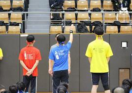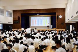 体育祭前日、講堂には1~5年生が集い、体育祭決起会が行われました。 事前にくじ引きで分けられた男...