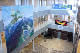 初めての秀峰祭で、生徒たちが最も頑張ったのが「モザイク画」展示と合唱。モザイク画では1組は生徒創作の...