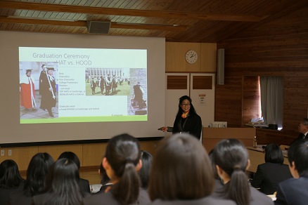 奉教授はケンブリッジ大学(クイーンズカレッジ)にて博士号を取得されており、ケンブリッジでの生活を中心に、イギリスの文化や歴史など、実体験を交えながらお話いただきました。とても興味深い内容で、生徒からは次々に質問があがり、予定していた時刻を過ぎてしまいましたが、奉教授は最後まで丁寧に生徒の質問に答えてくださいました。