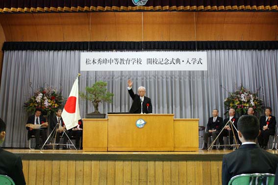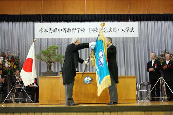 開校記念式典では、学校法人松商学園の藤原理事長による「開校宣言」をもって開校を表明、続いて、理事長から小宮山校長へと「校旗授与」が行われ、多くの方々に見守られる中、学校がスタートしました。