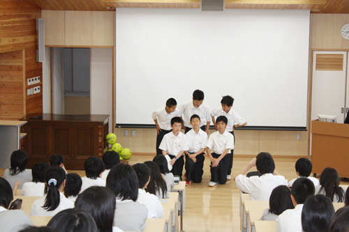 2010.06.21 ふれあい集会 Tweet 松本秀峰では、月曜日にふれあい集会(学年全体での朝礼)を催しており、5月下旬からは、各部活動が活動内容や目標などを紹介する時間になっています。発表原稿を作成するのも、撮影した映像を編集するのも、ライブパフォーマンスを計画するのも、全て部員達です。発表時間は10分足らずですが、この活動を通して、部員同士の結束力や意識が高まったと顧問の先生方からも好評です。 前の記事 次の記事