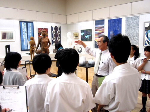 2010.07.01 松本市美術館にて美術の授業 Tweet 美術の授業として、松本市美術館で開催されている『中信美術展覧会』に行ってきました。 鑑賞の仕方は「目で見ないで、心で見る」。 美術館は作者・作品と対話をするところだから「言葉はいらない」。 全員が真剣に作品と向き合っていました。 本校は松本市美術館の他に、まつもと市民芸術館も徒歩圏内という、大変に恵まれた環境にあります。生徒たちの感性も、のびのびと磨かれているところです。 来週はまつもと市民芸術館にて、平成中村座『佐倉義民傳』の舞台裏を見学する予定です。 前の記事 次の記事