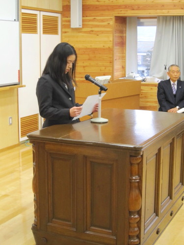 生徒代表は、「一年間の総まとめをきちんとして、良い先輩として2期生を迎え入れたい」という決意を発表しました。