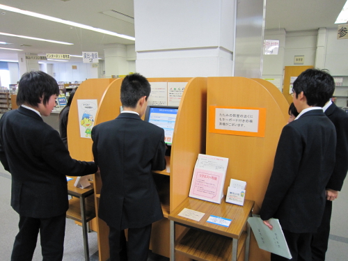 に、松本市中央図書館のご協力をいただき調べ学習を行いました。生徒は2~3人のグループを作り世界各国の文化や歴史などの調べたい内容を決め、テーマに沿った本を探しました。約31万冊の中から検索機で絞って探すことは大変そうでしたが、生徒一人ひとりが発表に向け頑張っていました。