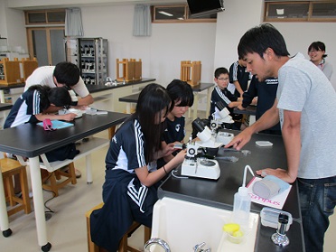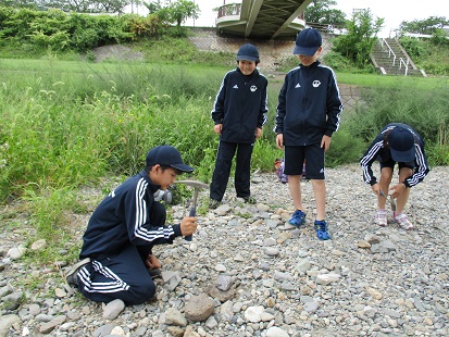 フィールドワークではさまざまな水生生物を採集したり、川原の岩石を割って内部の様子を観察したりしました。当初、調査用の網やハンマーの扱いに苦労していましたが、信州大学の方々のご指導のもと、次第にコツをつかんでいきました。今回の調査には、地質の専門家である小坂校長も調査に同行されていました。部員が割るのに苦労していた大きな岩石を校長がいとも簡単に割った際には、一同とても驚いていました。野外で採集した生物や岩石は顕微鏡やルーペで観察し、種類を調べました。