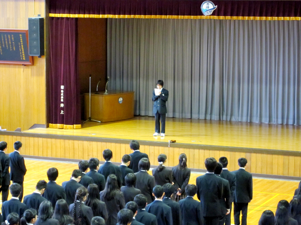 生徒会長・副会長の司会進行により、まずは、入学してから1ヶ月経った感想を1年生が発表。